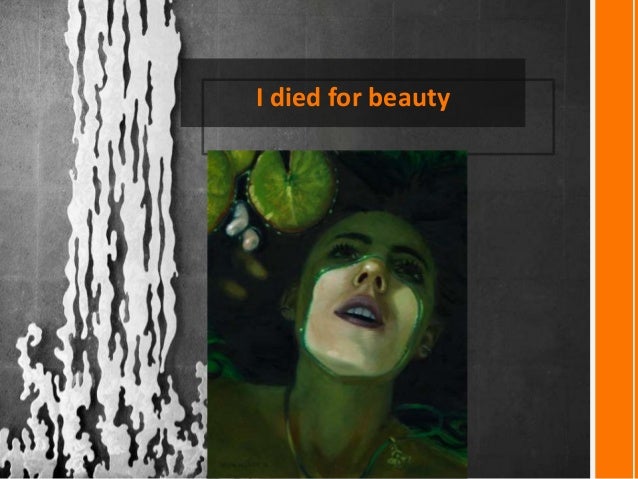 We may now add that beauty and truth are focuses of experience, intensified moments of our perception of the universe and man's destiny in it. Most philosophers and artists assume that all art aspires towards the beautiful. The fact that they died for an ideal is. In i died for beauty the speaker declares that she died for beauty, and as she was placed in her tomb, another person is placed in a nearby room. Emily dickinson's poem i died for beauty is an intriguing and indeed startling work in a number of different ways. How they died isn't known, isn't necessarily important. I died for beauty, but was scarce.