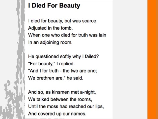 Source: image.slidesharecdn.com The speaker says that she died for beauty, but she was hardly adjusted to her tomb before a man who died for truth was laid in a tomb next to her. Write down the first words that enter your head… * beauty * truth 3. I died for beauty but was scarce i died for beauty but was scarce adjusted in the tomb, when one who died for truth was lain in an adjoining room.