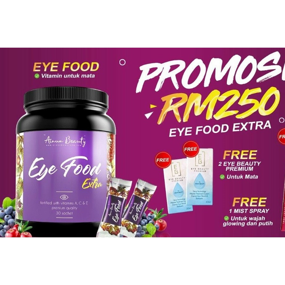 Rm 250.00 add to cart. ️sale ️eye food extra by ainun beauty (30 sachet) original hq + free gift. Eye food extra ialah produk yang dihasilkan daripada 6 jenis buah beri segar yang terbukti dalam menjaga kesihatan mata pada semua peringkat umur.